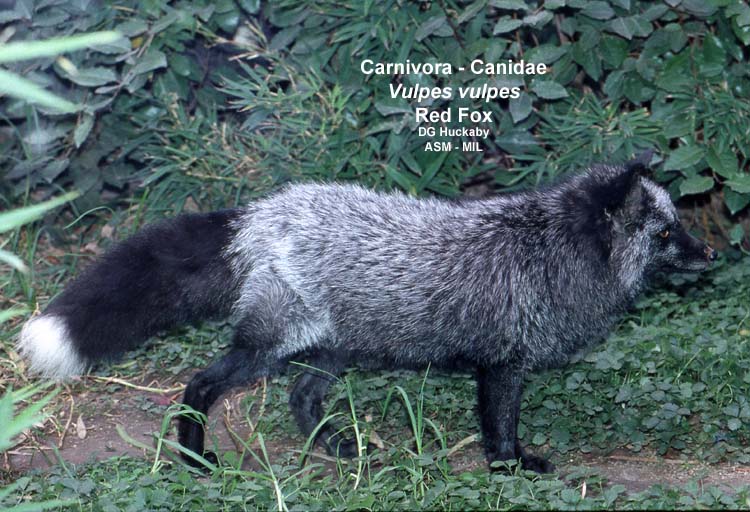 black or silver variety, distinguishable from similarly colored arctic foxes by the white tail tip.