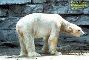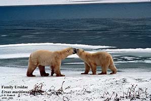 | Description | Largest of bears, with long neck and small head. White to yellowish with black muzzle and nose. Genetically close to brown bears and can produce fertile hybrids, the offspring adopting the culture of the mother. |