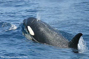 | Description | Cetacean subgroup Odontoceti. Largest of family. Distinct coloration, black dorsally, white ventrally, white eye patch. Large paddle-like pectoral flippers. Adult males are much larger and have tall triangular dorsal fins up to 1.8 m in length. Female and younger animals have falcate dorsal fin. Size: up to 8 m, 5 metric tons. |